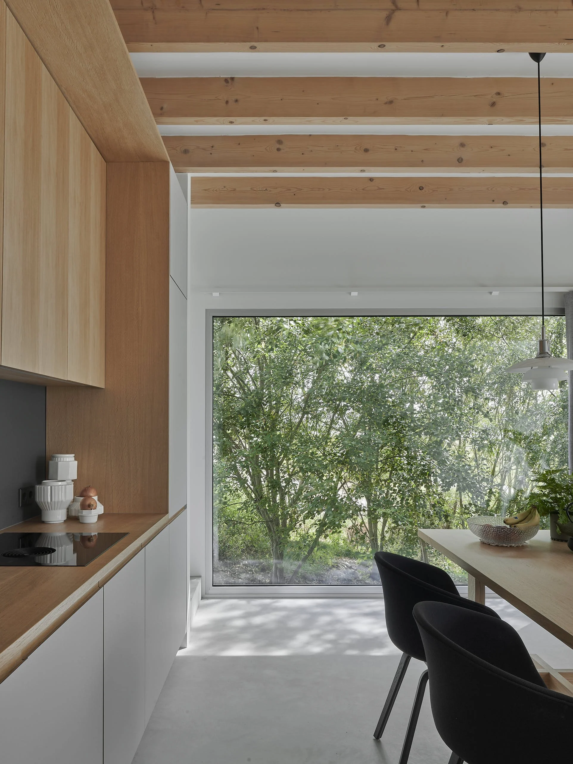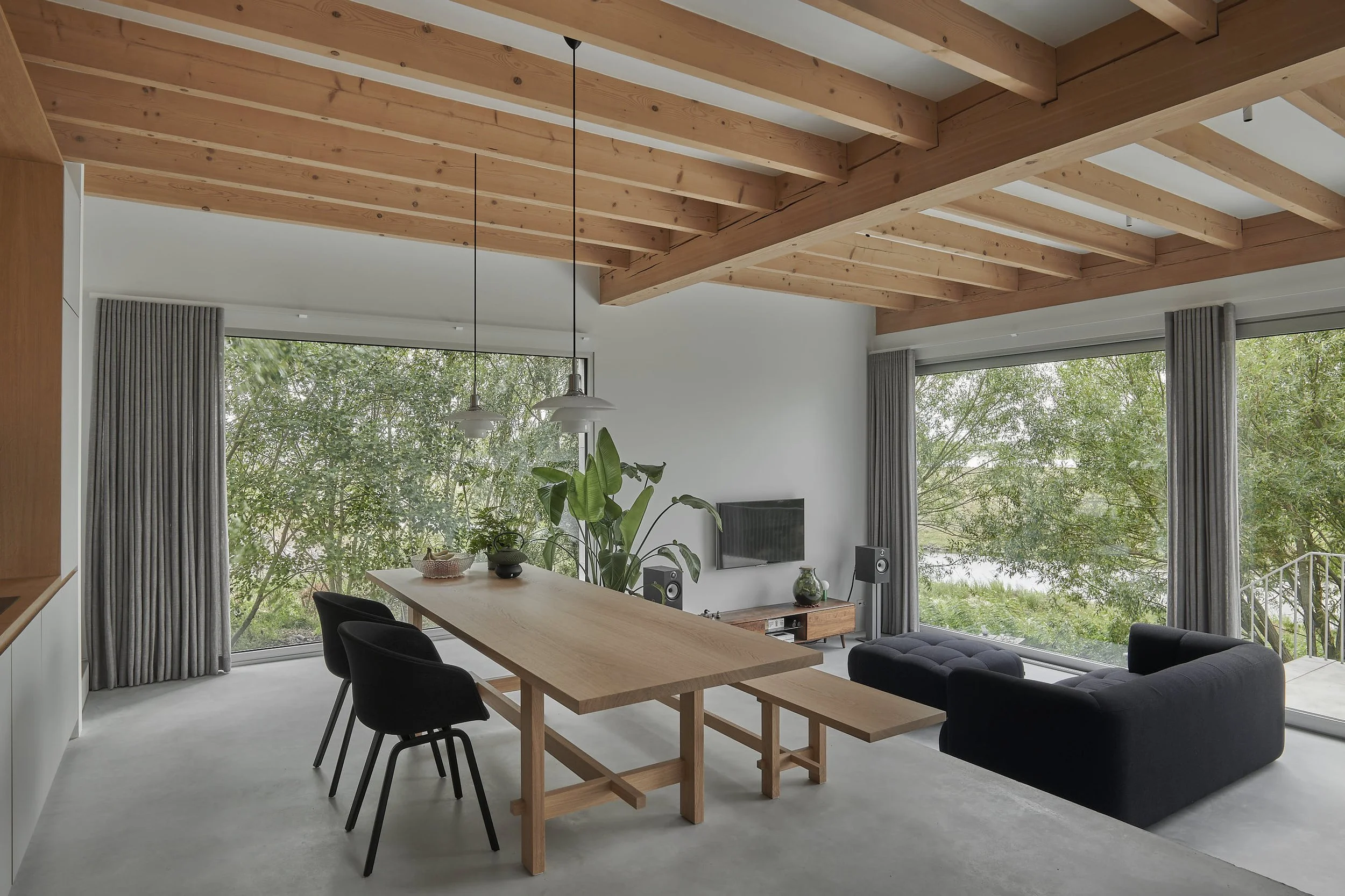 The house consists of several sustainable elements in fitting with the surrounding natural landscape. First, its form ensures long term resilience as nearby river water levels are increasingly prone to flooding. In terms of energy efficiency, a combination of solar panels, high wall insulation, triple-glazed windows, and a heat pump ensures enhanced energy performance, reducing demand.