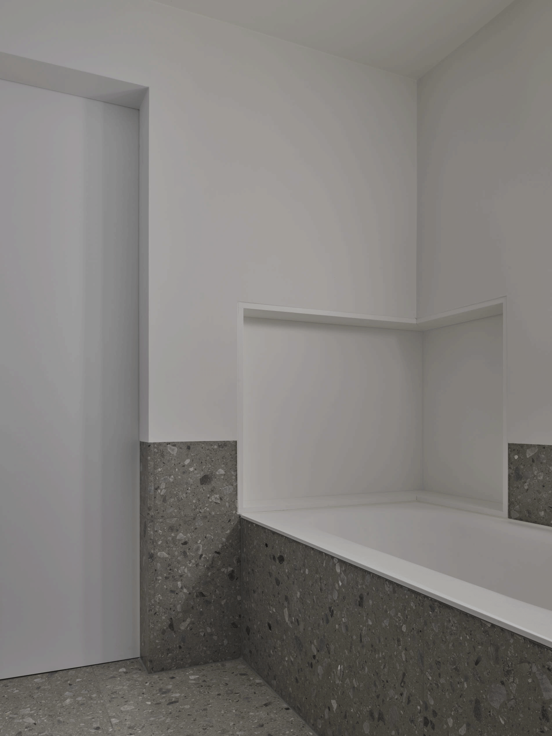 Compact but spacious with broad perspectives, voids, and a wide upper level corridor, the spatial organisation maximises the interior experience. Timeless interior detailing and materials also work to ensure that views to the landscape and spatial experience remain the dominant features. Poured in place concrete with in-floor heating on the ground floor provides a serene and comfortable living area, while a wood staircase and engineered wood planks on the first floor emphasise a natural materiality. Neutral white stucco walls frame the flowing interior spaces. Clad in durable and quietly elegant grey terrazzo tiling, the bathrooms enjoy open window views to the surroundings.